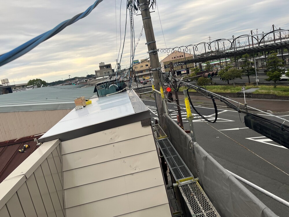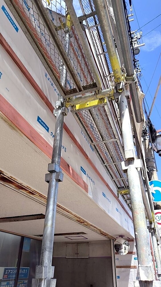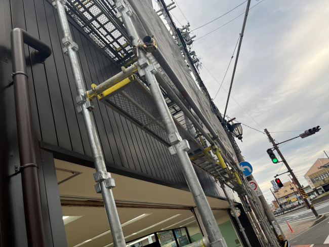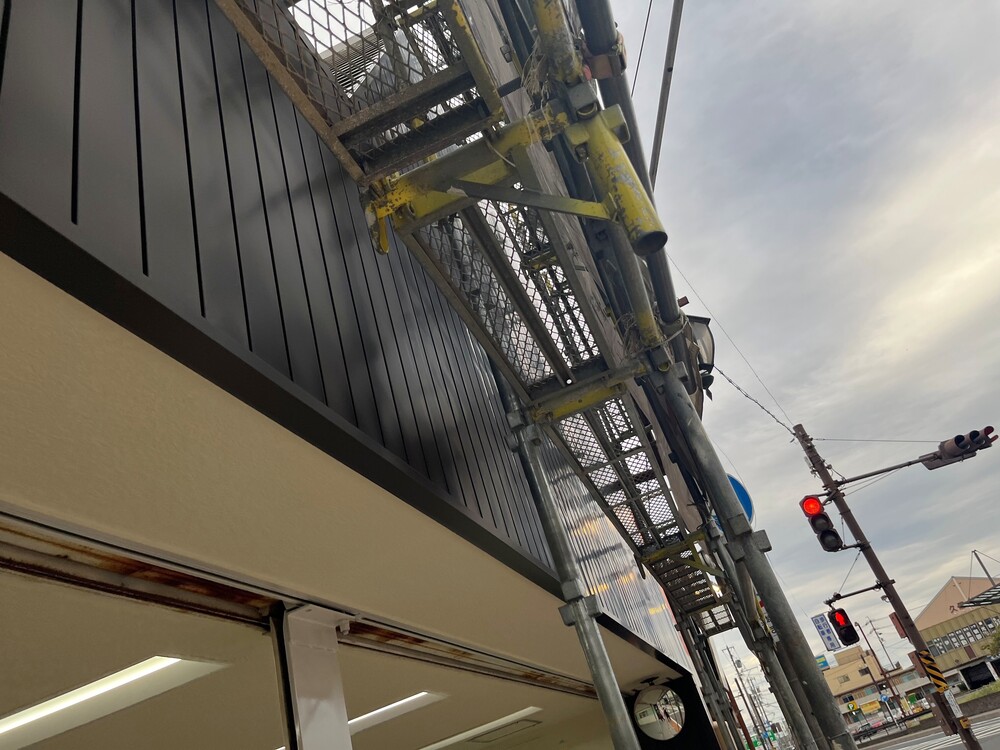(株)林電気商会様にてご依頼いただいた、外壁カバー工法、シャッター塗装、看板の撤去新設、樋交換工事、笠木工事など、多岐にわたる大規模リフォームを、足場工事から道路占有申請まで一括で実施した実例をご紹介します。